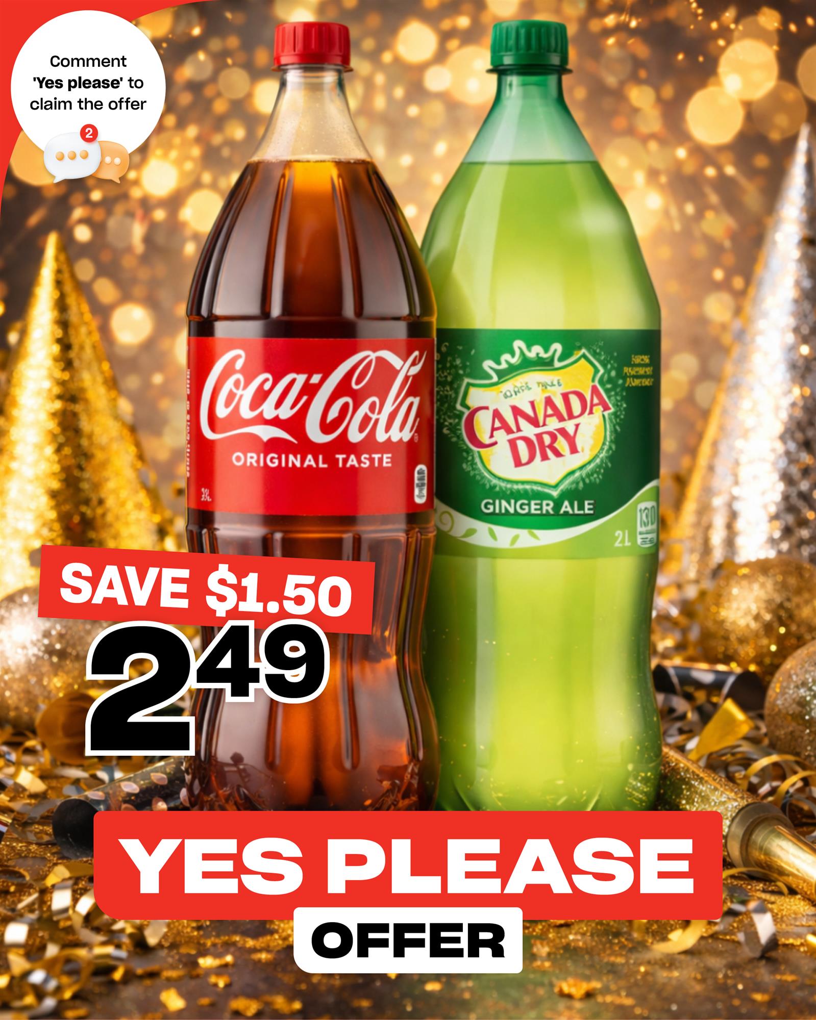 Ring in the New Year with a refreshing deal! Grab a 2L bottle of Coke or Gingerale – perfect for parties, mixers, or family dinners.