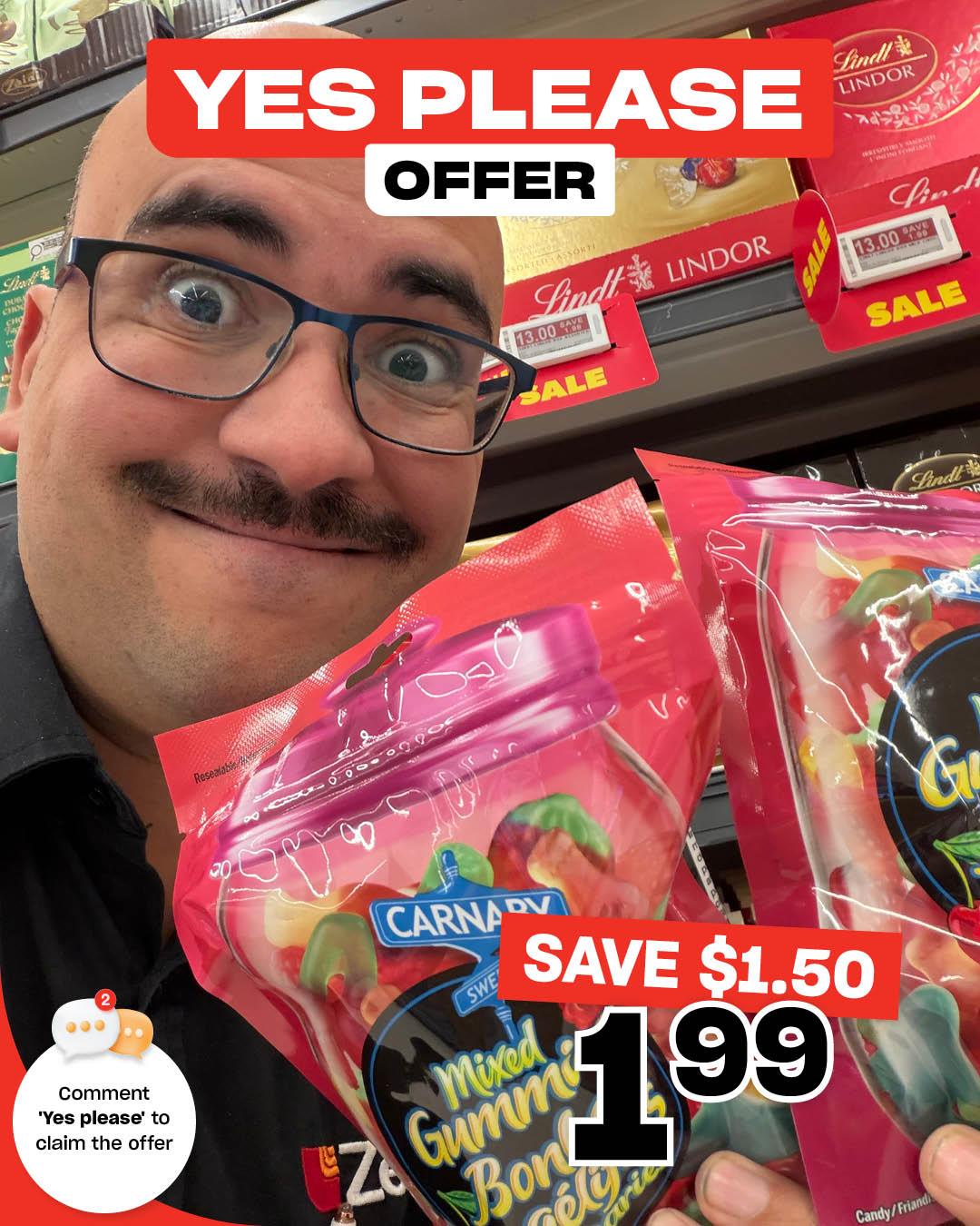 🍭😋 YES PLEASE OFFER · SAVE $1.50 · CSR MIXED GUMMIES 300G $1.99 😋🍭