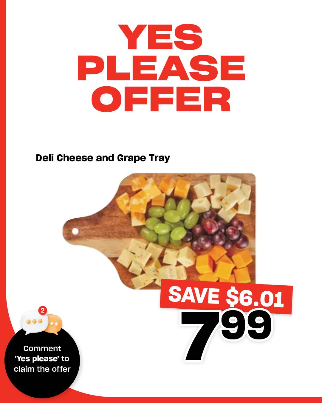 🧀🍇 YES PLEASE OFFER · SAVE $6.01 · DELI CHEESE AND GRAPE TRAY $7.99 🍇🧀