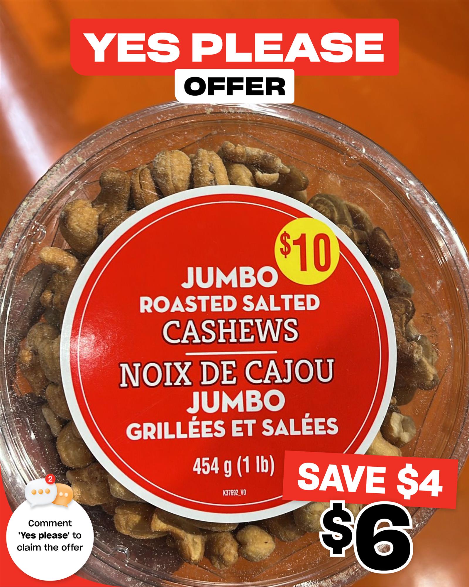 🥜😋 YES PLEASE OFFER · SAVE $4 · JUMBO ROASTED SALTED CASHEWS $6 😋🥜