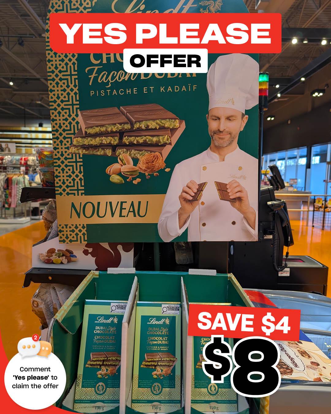 🍫🌟 YES PLEASE OFFER · SAVE $4 · LINDT CHOCOLATE MILK DUBAI STY $8 🌟🍫
