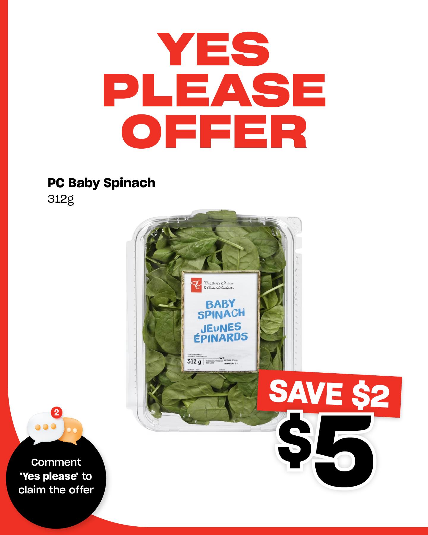 🥗🌿 YES PLEASE OFFER · SAVE $2 · PC BABY SPINACH 312g $5 🌿🥗