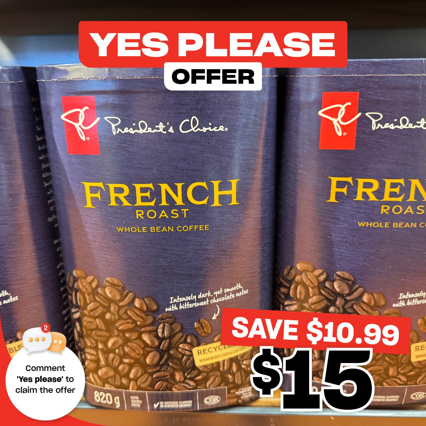 ☕🇫🇷 YES PLEASE OFFER · SAVE $10.99 · PC FRENCH ROAST WHOLE BEAN COFFEE 820G $15 🇫🇷☕