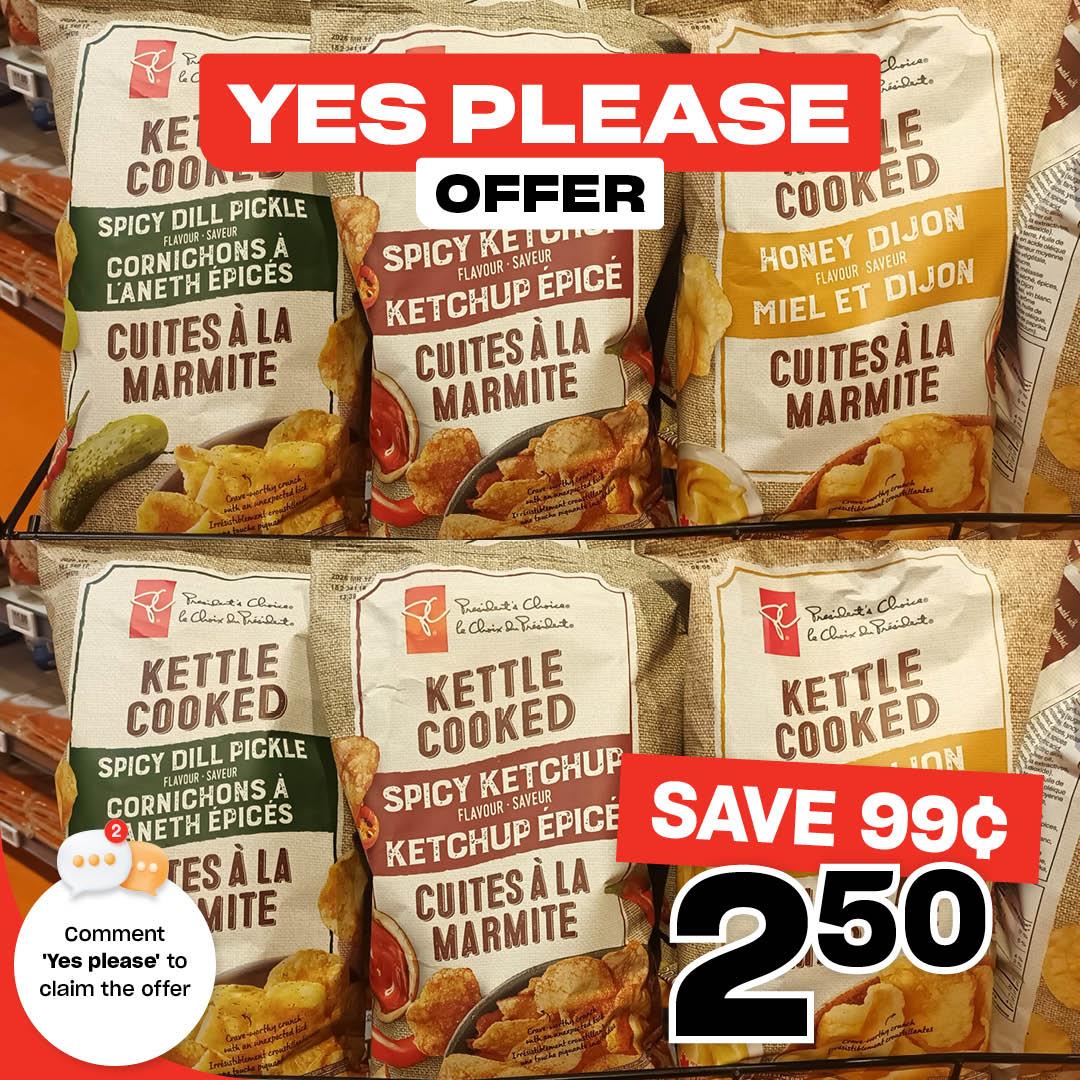 🥔😋 YES PLEASE OFFER · SAVE $0.99 · PC KETTLE CHIPS 200G $2.50 😋🥔