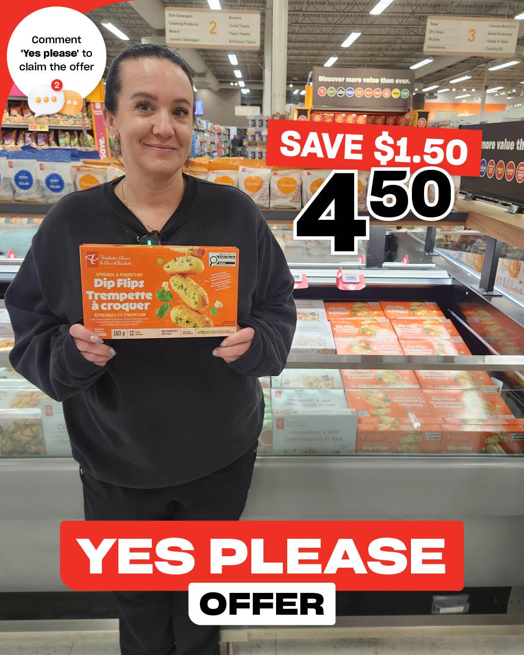 🧄🧀 YES PLEASE OFFER · SAVE $1.50 · PC SPINACH AND PARMESAN DIP FLIPS $4.50 🧀🧄