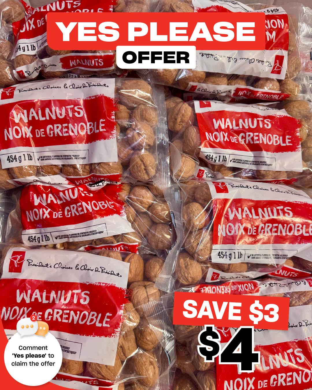 🌰🎁 YES PLEASE OFFER · SAVE $3 · PC WALNUTS 454 g $4 🎁🌰