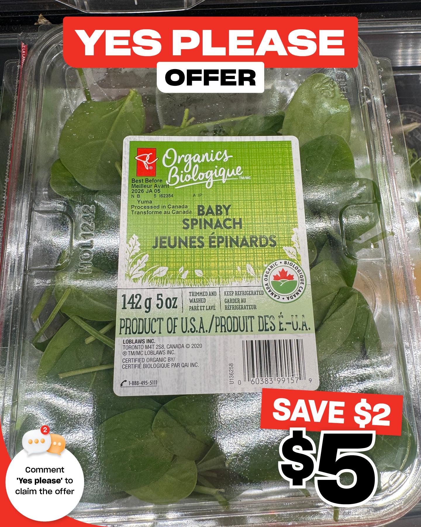 🥬💚 YES PLEASE OFFER · SAVE $2 · PCO SPINACH BABY 312G $5 💚🥬