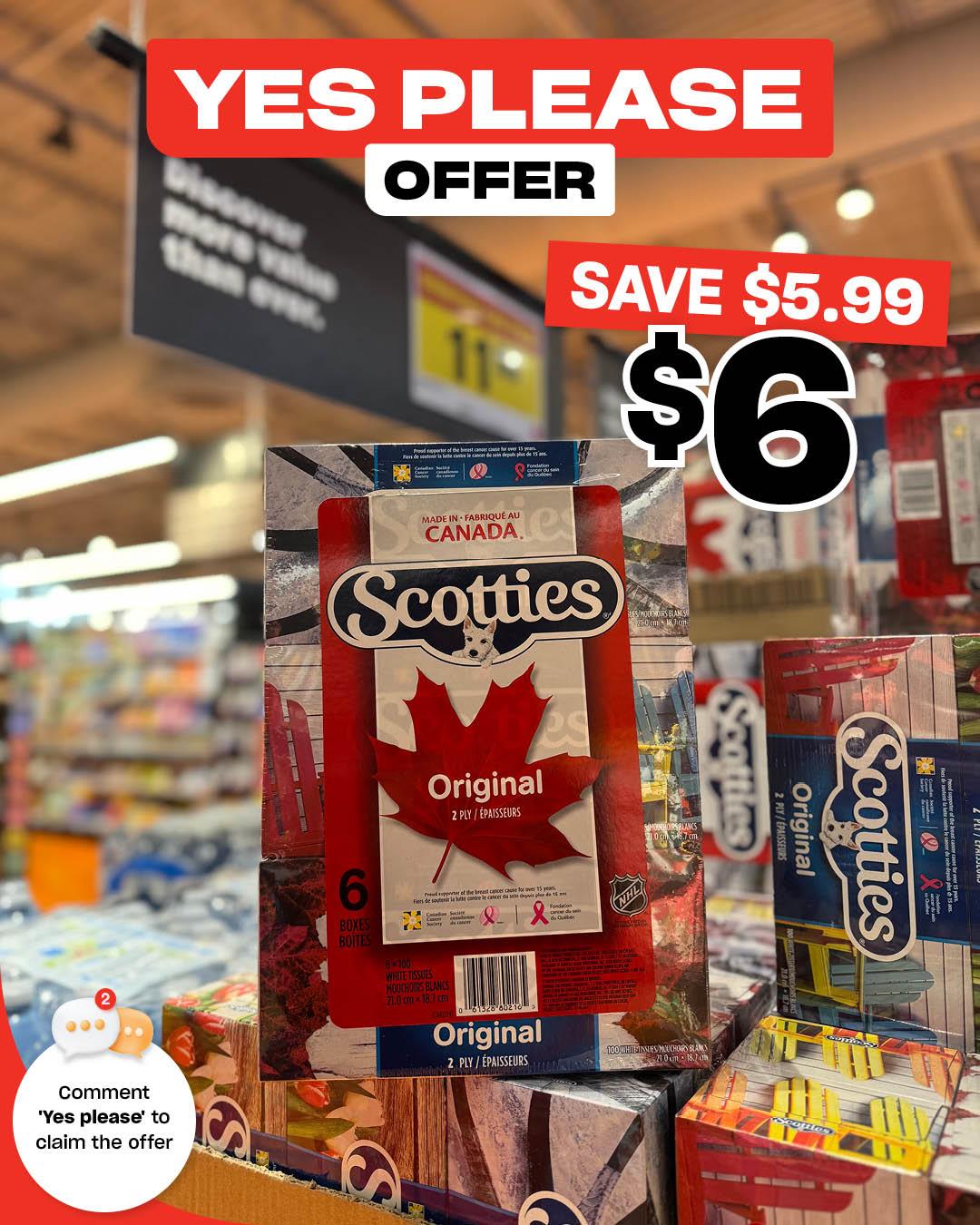 🧻💨 YES PLEASE OFFER · SAVE $5.99 · Scotties (6-box pack) $6 💨🧻