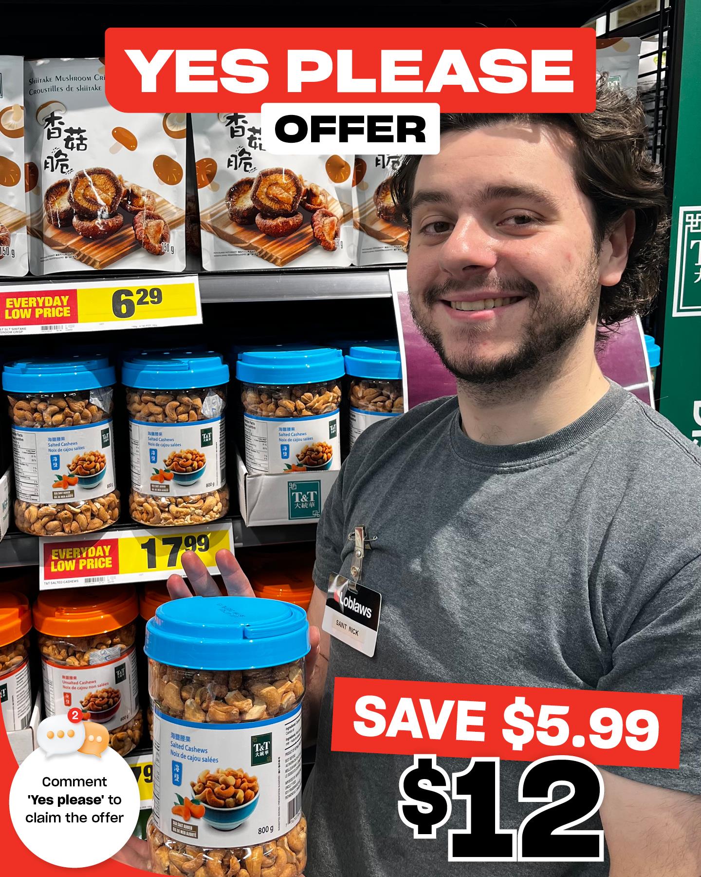 🥜😋 YES PLEASE OFFER · SAVE $5.99 · T&T CASHEWS $12 😋🥜