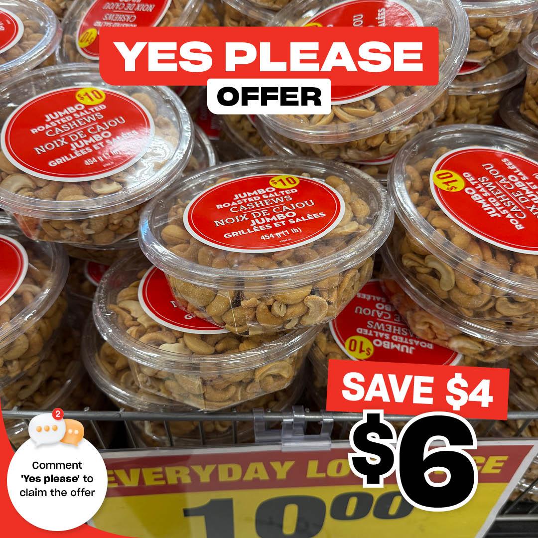 🥜😋 YES PLEASE OFFER · SAVE $4 · Jumbo Roasted Salted Cashews $6 😋🥜